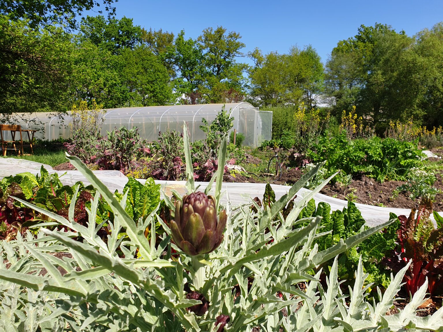 La visite du Domaine les Bruyères a été un coup de cœur et le projet a pris une autre envergure : un parc de 1,5 hectares sur lequel ils ont créé leur potager en permaculture de 2000 m2 et une forêt fruitière. Ils ont également rénové la bâtisse qui date de 1850 pour ouvrir 5 chambres d’hôtes et RUCHE, le restaurant à l’automne 2019.