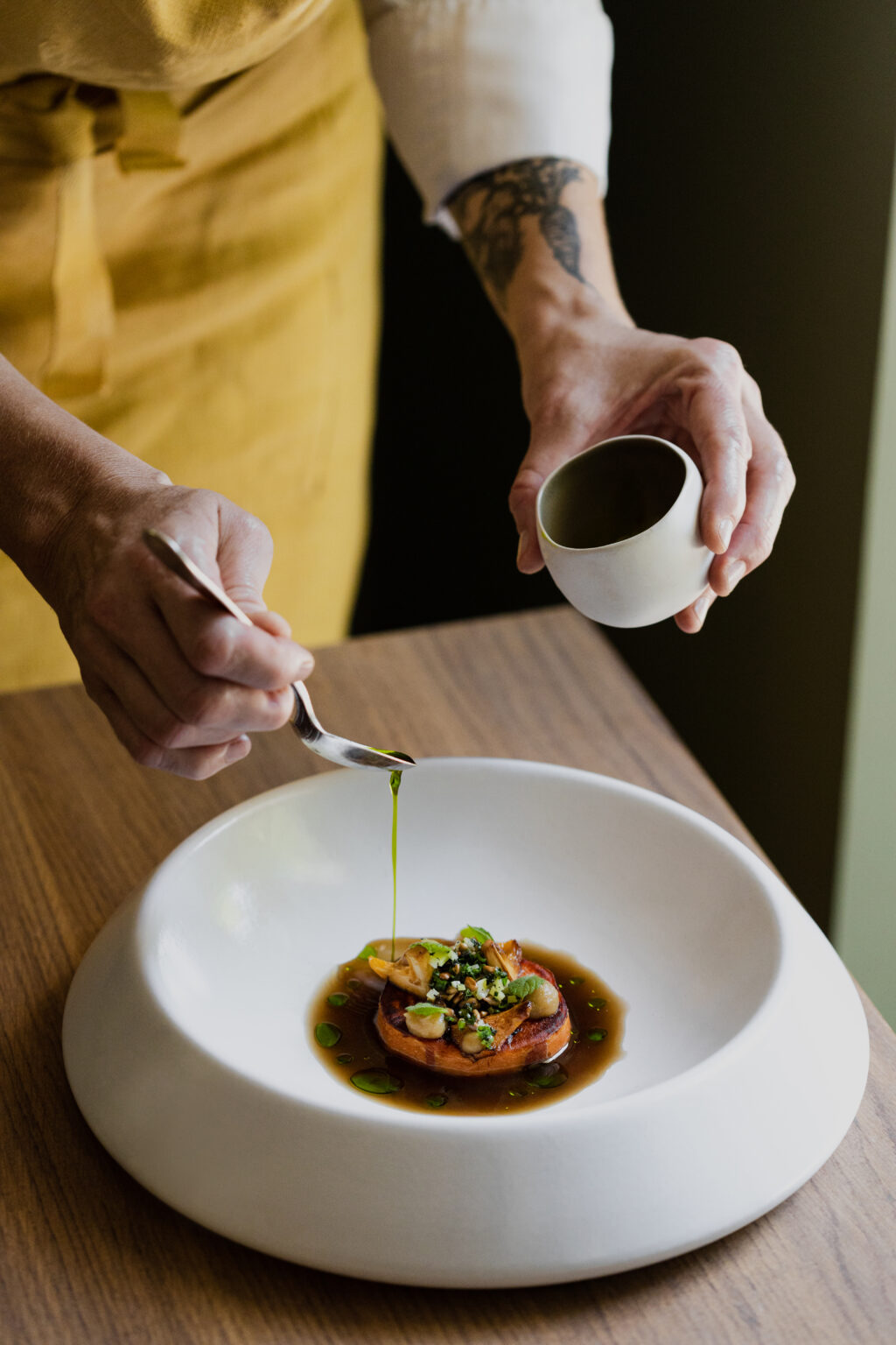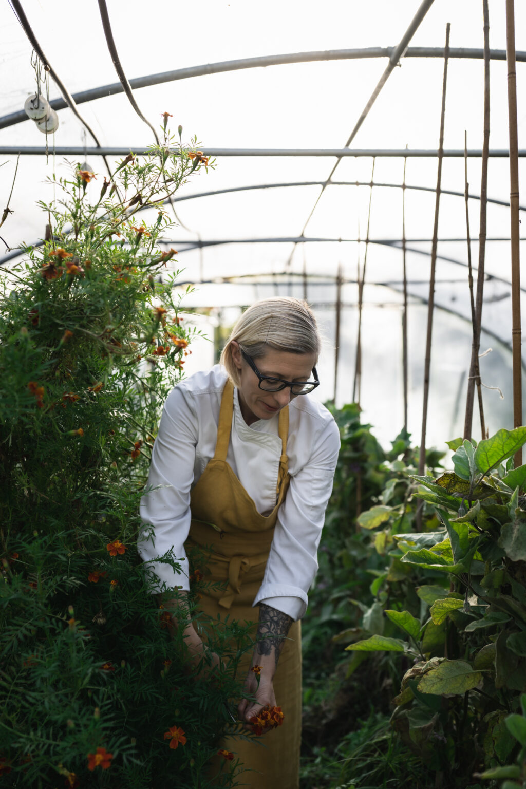 Travaillant son propre écosystème, elle propose une cuisine de l’instant en appliquant les techniques ancestrales pour sublimer les produits provenant du potager et d’artisans/éleveurs situés à quelques kilomètres du Domaine.