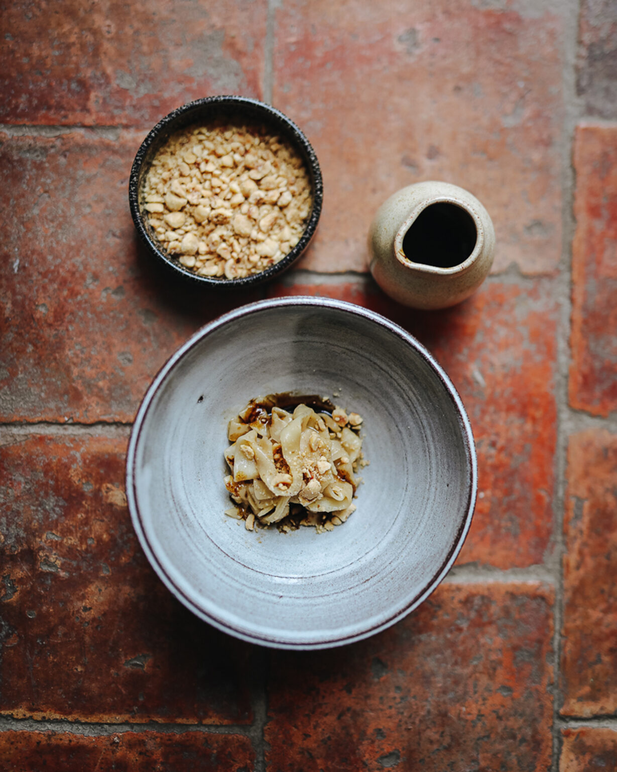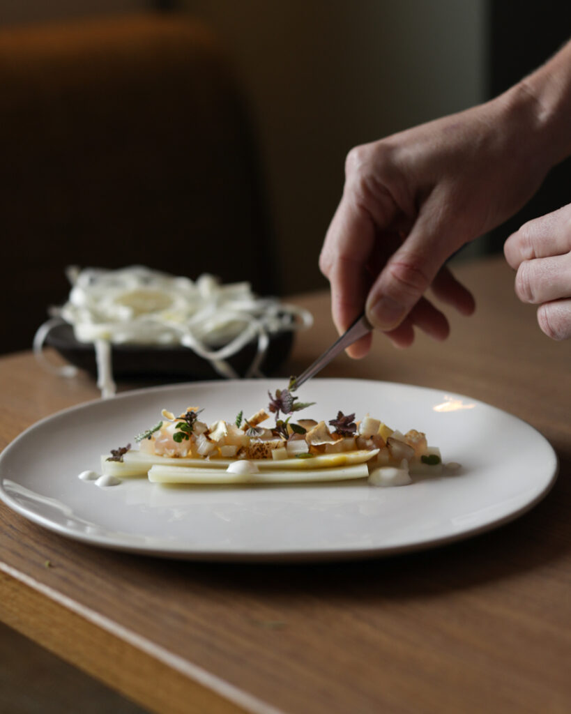 Tartare de Radis, Graines d’Ail des Ours façon Câpres, Pickles de Graines de Moutarde: Radis cuit dans une marinade, puis légèrement déshydraté et passé par le hachoir pour une texture incroyable